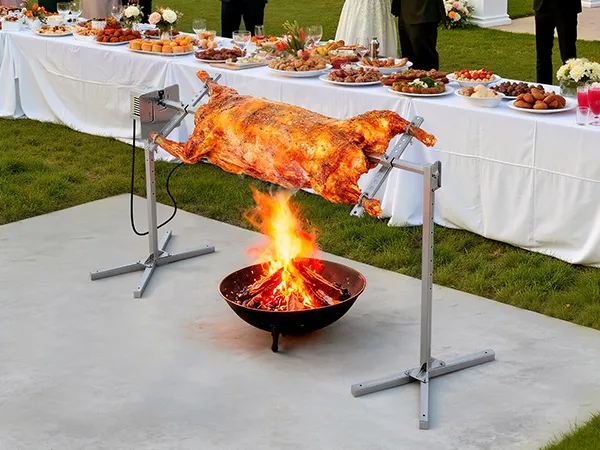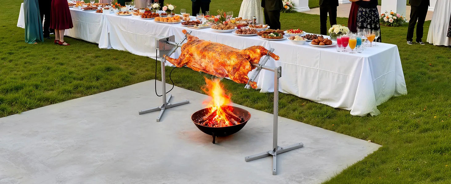 Parrilla Multiusos: Disfrute de un kit de parrilla portátil y automático, ideal para comidas al aire libre, banquetes de boda, campamentos o celebraciones festivas. Su sencillo montaje permite asar cerdos enteros, corderos, pavos y falda de res sin esfuerzo