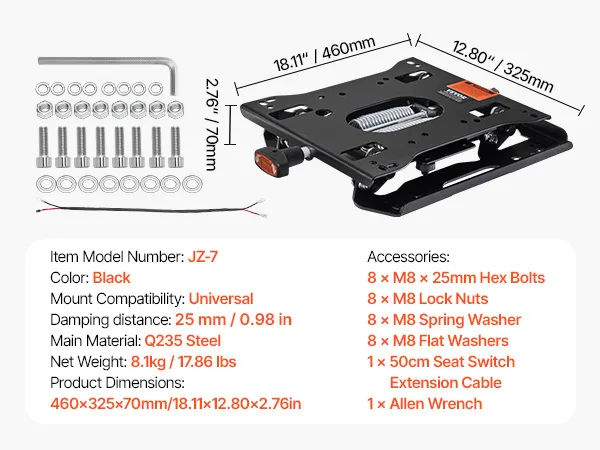 Construcción duradera: Hecho de acero resistente de 3 mm y recubierto con un acabado electrostático, este kit de suspensión de asiento universal está diseñado para brindar durabilidad y resistencia a la corrosión, lo que lo hace perfecto para las duras condiciones de trabajo al aire libre