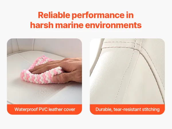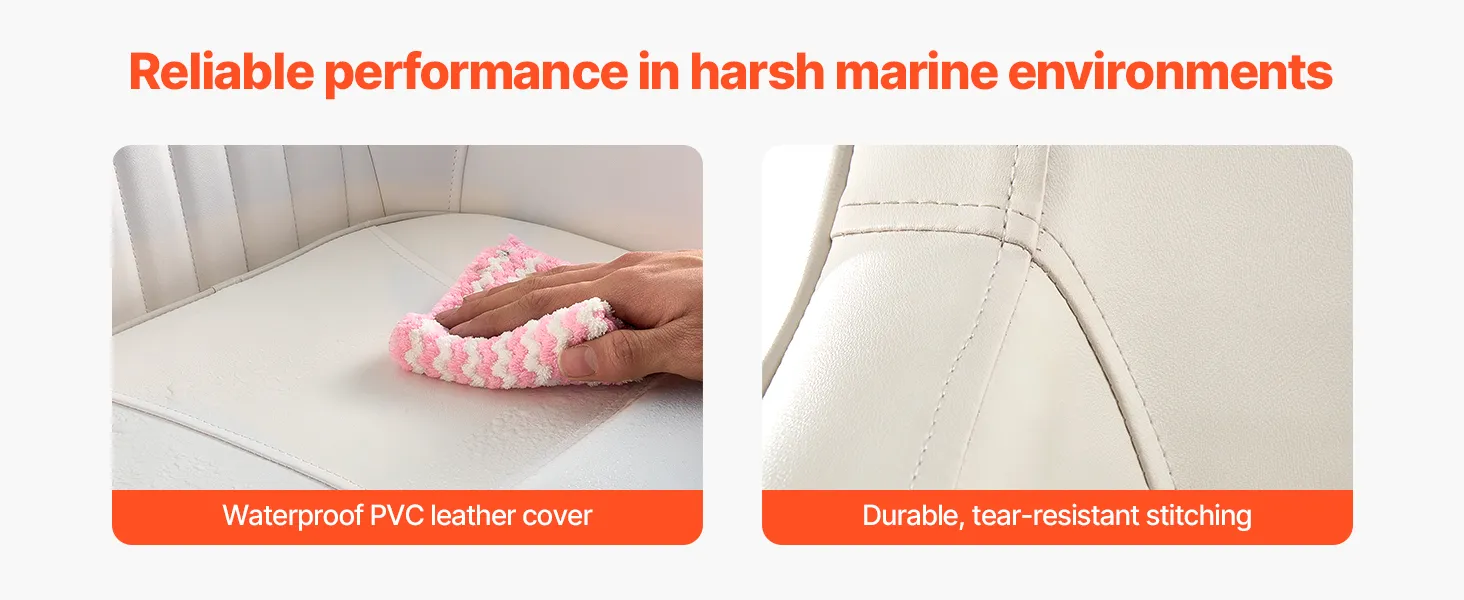 Asiento impermeable: La superficie del asiento del barco está hecha de cuero de PVC, lo que le proporciona características impermeables, resistentes al desgaste y a los rayos UV. Está cosido por expertos para evitar desgarros y está diseñado para soportar entornos marinos y al aire libre, lo que garantiza su durabilidad