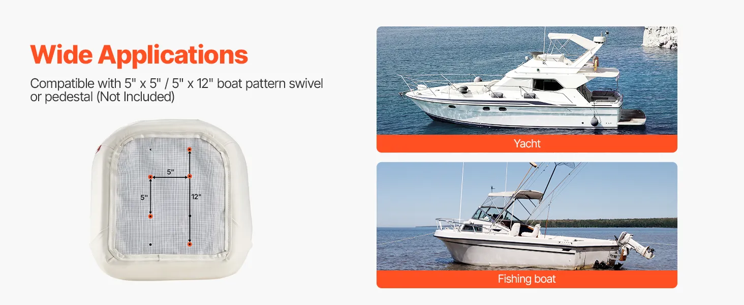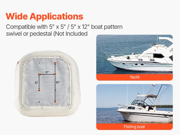 Los orificios de montaje inferiores miden 5,3 pulgadas x 5,3 pulgadas, lo que le permite colocar el asiento del barco de pesca directamente en la plataforma o montarlo en la mayoría de las bases de soporte. Tenga en cuenta: las bases giratorias y las bases de soporte no están incluidas.