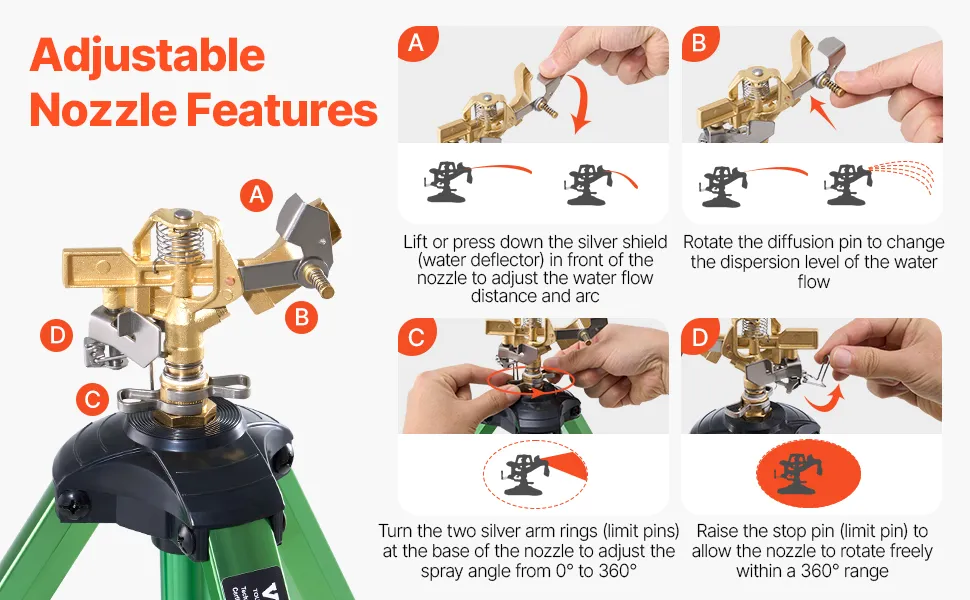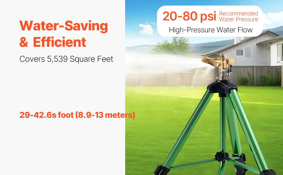 Aspersor ajustable: El aspersor para césped gira libremente de 0° a 360°, con rango de flujo de agua y arco ajustables, adecuado para jardines y patios de diferentes formas y tamaños. Presión de agua recomendada: 20-80 psi