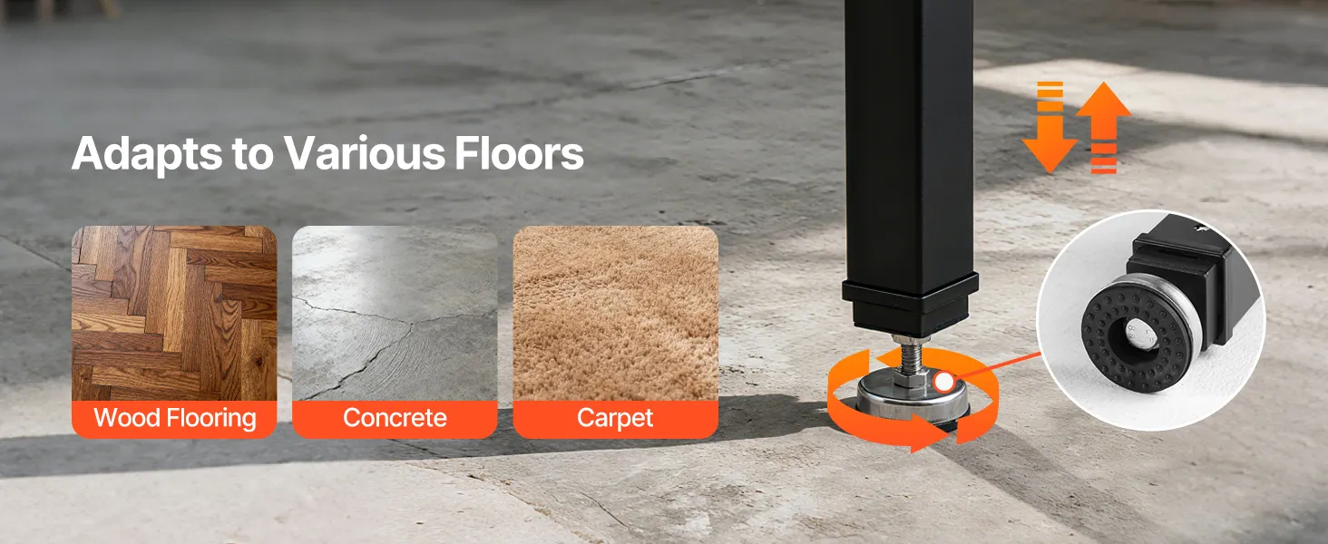 Preparada para suelos irregulares: Esta robusta mesa de trabajo incluye cuatro patas niveladoras para una rápida estabilización. Las bases de goma proporcionan agarre y evitan deslizamientos, manteniendo la mesa firme en tu espacio de trabajo