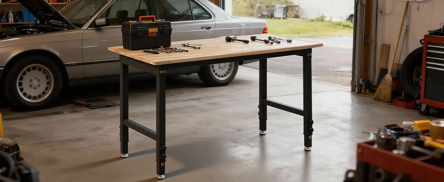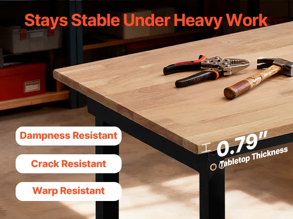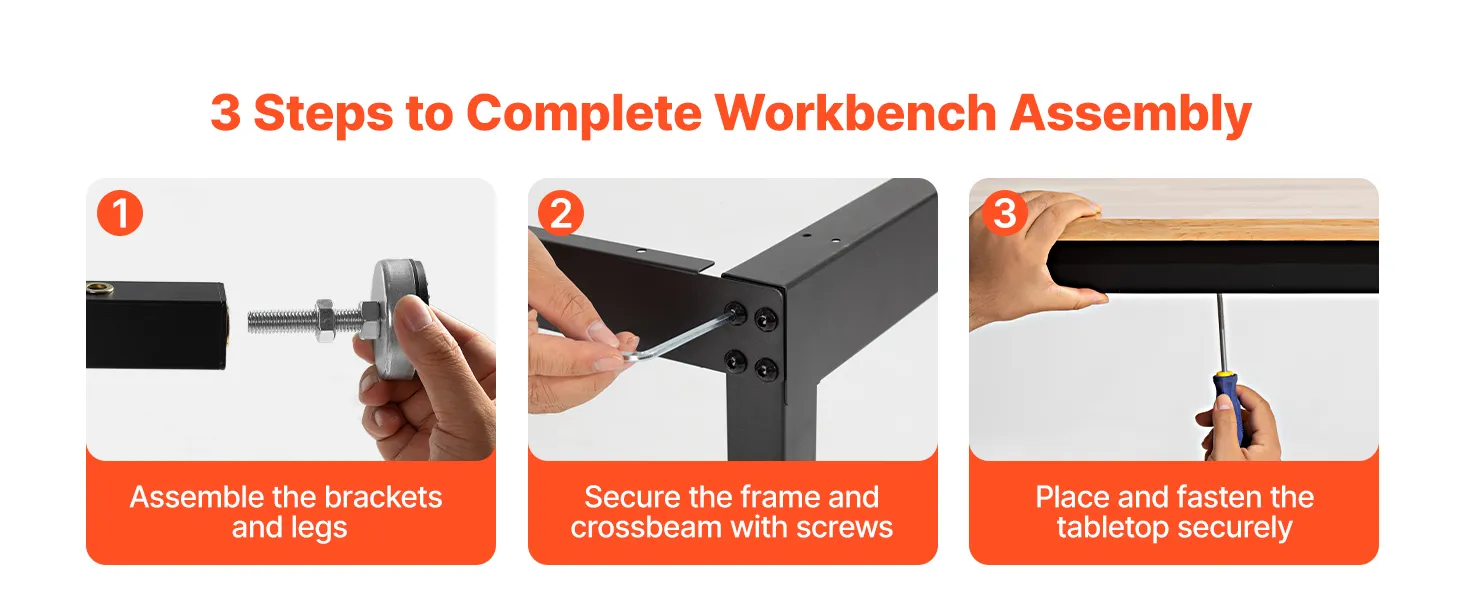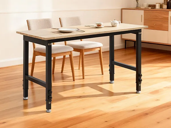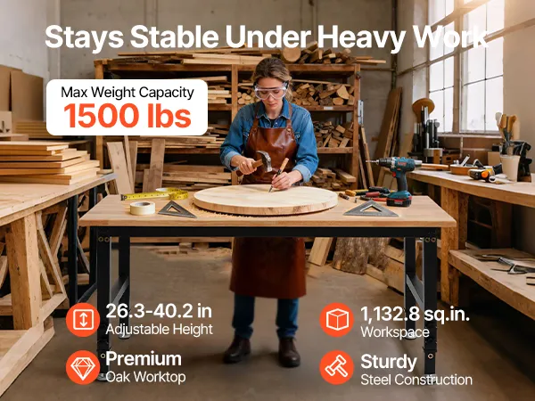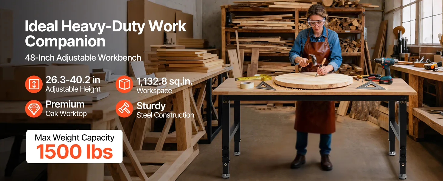Banco de trabajo resistente con capacidad de 680 kg: Esta mesa de trabajo ajustable ofrece una superficie de 122 x 60 cm y soporta hasta 680 kg. Podrá organizar herramientas y realizar tareas de corte, perforación o almacenamiento pesado con total seguridad
