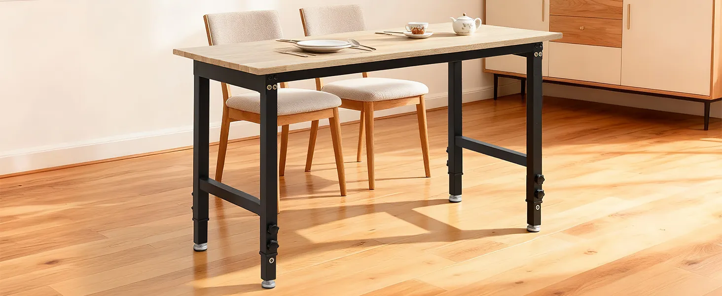 Ajuste de altura en 8 posiciones: Este banco de trabajo con superficie de roble se ajusta de 67 a 102 cm moviendo los tornillos de las patas. Consigue una posición cómoda para trabajar sentado o de pie, para que cada usuario encuentre su postura ideal