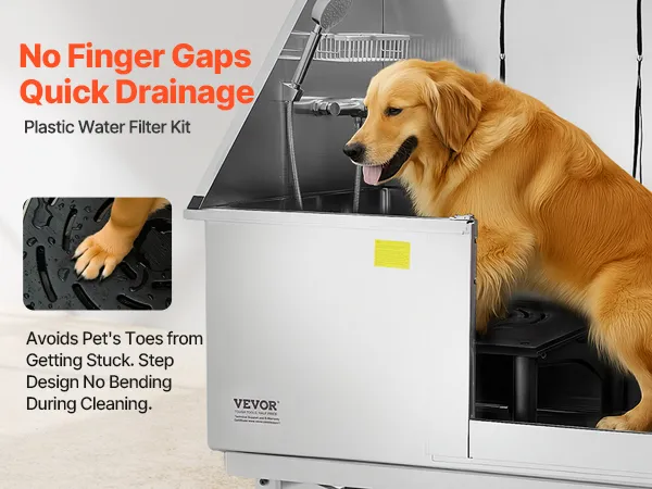 Diseño integrado: La soldadura redondeada sin costuras proporciona un mejor sellado y facilita la limpieza. La bañera para perros cuenta con grifos de agua fría y caliente, un cabezal de ducha de doble control y una jabonera. Este diseño simplifica y agiliza el proceso de baño. El filtro de agua de polietileno proporciona una superficie de drenaje antideslizante, y la hebilla de pico de pato incluida evita que las mascotas abran accidentalmente la puerta durante el baño