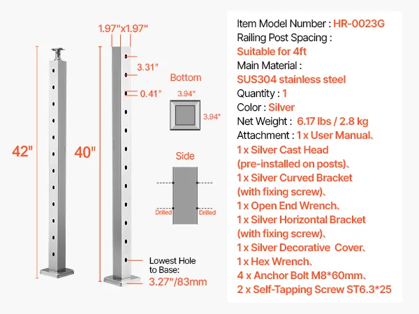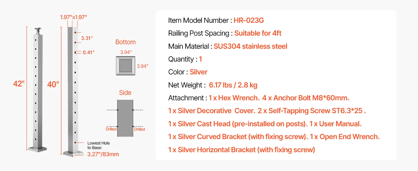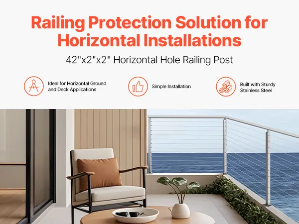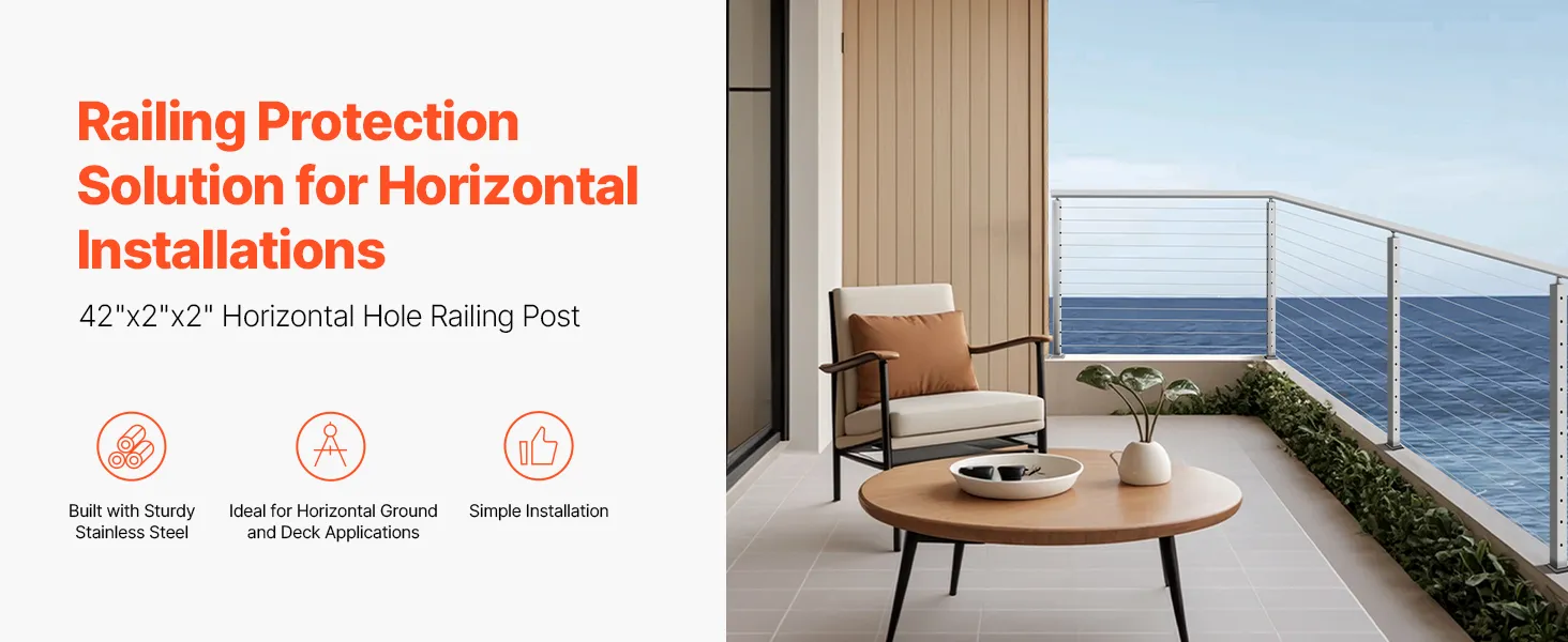Poste de barandilla con orificio horizontal: Este poste de barandilla con orificio horizontal está disponible en alturas de 107 cm y 91 cm, con orificios de 8 mm y 10 mm, para un total de 10 a 12 orificios. Está diseñado para la protección horizontal de barandillas de suelo/terraza, protegiendo a usted y a su familia. Nota: Este producto no incluye cables de acero