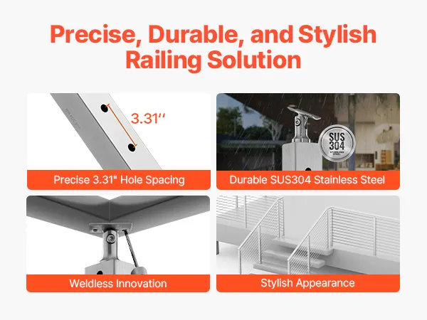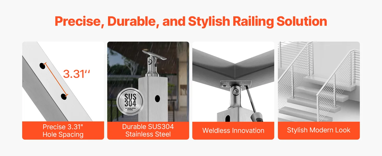 Fabricados en acero inoxidable SUS304 de alta resistencia, nuestros postes de barandilla de cable son duraderos y fáciles de instalar, con orificios y herrajes pretaladrados, son perfectos para asegurar cubiertas, barandillas, etc., cumpliendo con todos los requisitos de la normativa.