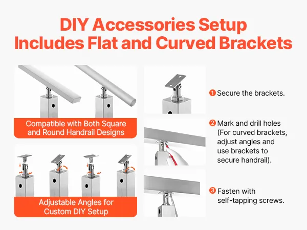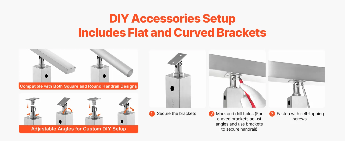 Fácil instalación y bricolaje: Este poste para barandilla de terraza incluye soportes horizontales y curvos, aptos para diversos tipos de orificios. Es compatible con pasamanos de tubo cuadrado y redondo, lo que permite personalizar los ángulos del pasamanos