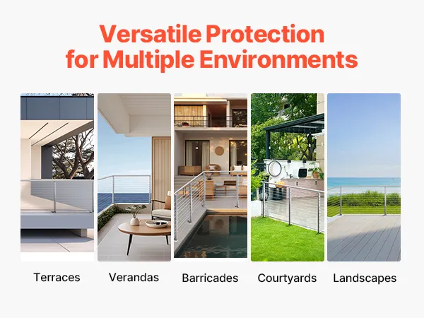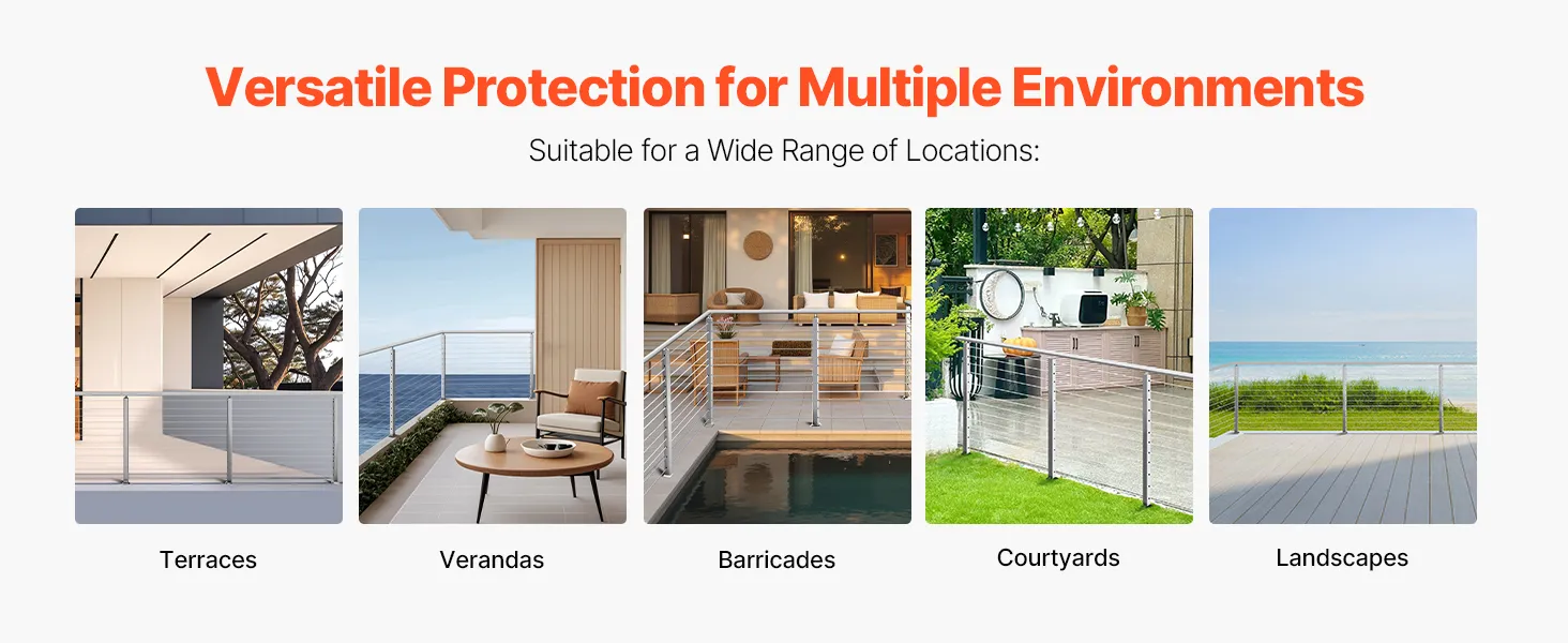 Este kit de barandilla de terraza es adecuado para aplicaciones de protección tanto en interiores como en exteriores, como terrazas, escaleras, porches, cercas, patios, balcones, jardines, edificios residenciales, oficinas comerciales, hoteles, garajes y más.