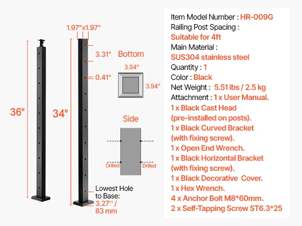 Poste de barandilla con orificio horizontal: Este poste de barandilla con orificio horizontal está disponible en alturas de 107 cm y 91 cm, con orificios de 8 mm y 10 mm, para un total de 10 a 12 orificios. Está diseñado para la protección horizontal de barandillas de suelo/terraza, protegiendo a usted y a su familia. Nota: Este producto no incluye cables de acero