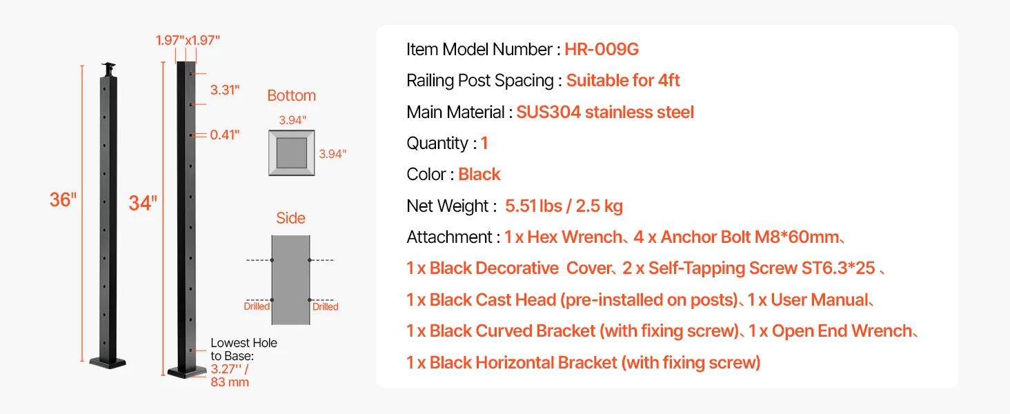 VEVOR Poste de Barandilla de Cable 1 Pieza Postes de Barandilla 91,4 x 5 x 5 cm Poste de Riel de Cable de Acero Inoxidable SUS304 con Soporte Horizontal y Curvo, Negro, 1JZLGZXHS9148RVYS001V0