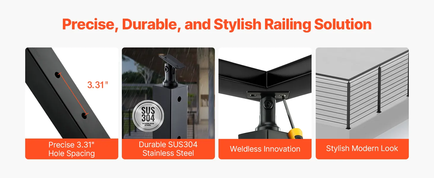 Nuestras barandillas de cable está fabricado con acero inoxidable SUS304 de alta calidad, con una separación entre orificios de 7,6 cm (3") que cumple con los códigos de construcción. No está soldado y tiene un acabado negro, lo que lo hace elegante y versátil para diversos entornos.