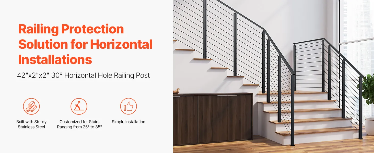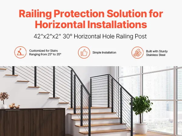 Poste de barandilla de cable con orificio de 30°: Este poste de barandilla de cable con orificio de 30° está disponible en alturas de 109 cm y 91 cm, con orificios de 8 mm y 10 mm, lo que suma un total de 10 a 12 orificios. Está diseñado para proteger escaleras en ángulos de 25 a 35 grados, garantizando la seguridad de usted y su familia. Nota: Este producto no incluye cables de acero