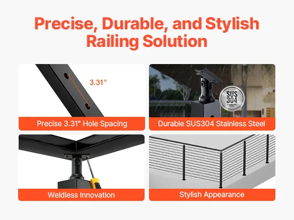 Nuestras barandillas de cable está fabricado con acero inoxidable SUS304 de alta calidad, con una separación entre orificios de 7,6 cm (3") que cumple con los códigos de construcción. No está soldado y tiene un acabado negro, lo que lo hace elegante y versátil para diversos entornos.