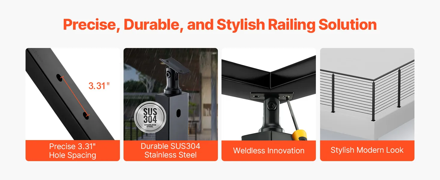 Resistente y duradero: Nuestro poste de pasamanos con cable está fabricado con acero inoxidable SUS304 de alta calidad, que ofrece excelente resistencia a la oxidación y protección contra la corrosión para una larga duración. Sin embargo, no se recomienda su uso en zonas costeras
