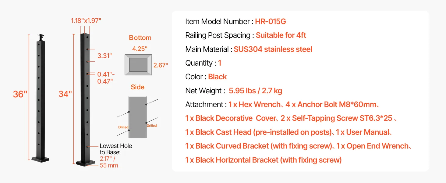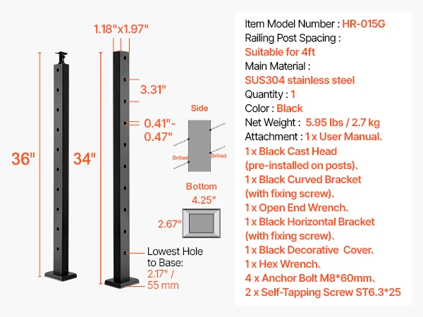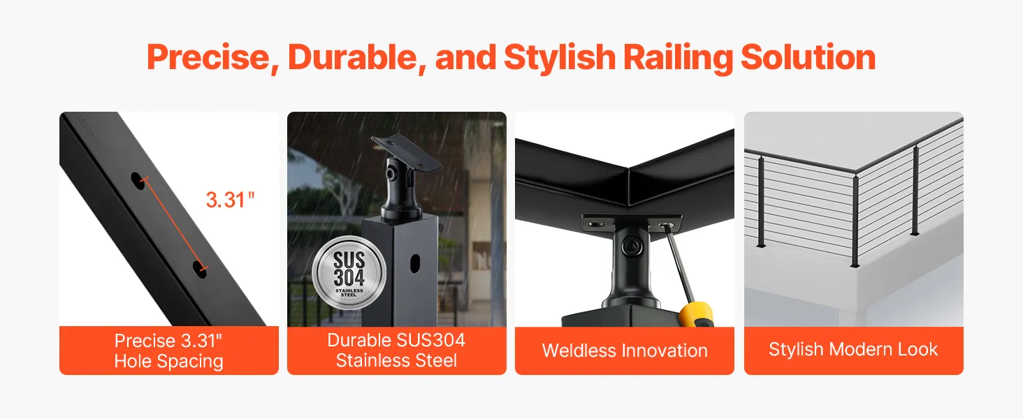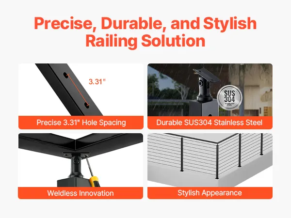 Resistente y duradero: Nuestro poste de pasamanos con cable está fabricado con acero inoxidable SUS304 de alta calidad, que ofrece excelente resistencia a la oxidación y protección contra la corrosión para una larga duración. Sin embargo, no se recomienda su uso en zonas costeras