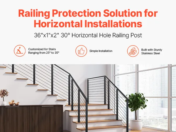 Poste de barandilla de cable con orificio de 30°: Este poste de barandilla de cable con orificio de 30° está disponible en alturas de 109 cm y 91 cm, con orificios de 8 mm y 10 mm, lo que suma un total de 10 a 12 orificios. Está diseñado para proteger escaleras en ángulos de 25 a 35 grados, garantizando la seguridad de usted y su familia. Nota: Este producto no incluye cables de acero