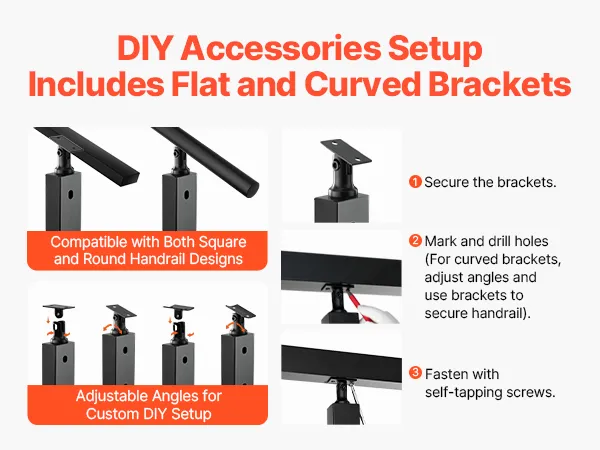 Fácil instalación y bricolaje: Este poste para barandilla de terraza incluye soportes horizontales y curvos, aptos para diversos tipos de orificios. Es compatible con pasamanos de tubo cuadrado y redondo, lo que permite personalizar los ángulos del pasamanos