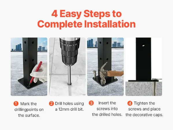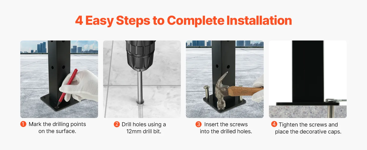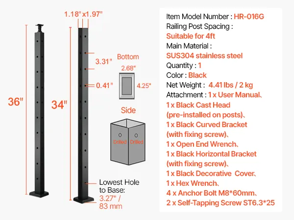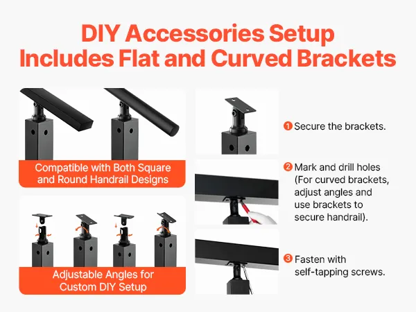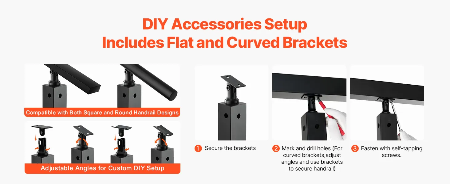 Fácil instalación y bricolaje: Este poste para barandilla de terraza incluye soportes horizontales y curvos, aptos para diversos tipos de orificios. Es compatible con pasamanos de tubo cuadrado y redondo, lo que permite personalizar los ángulos del pasamanos