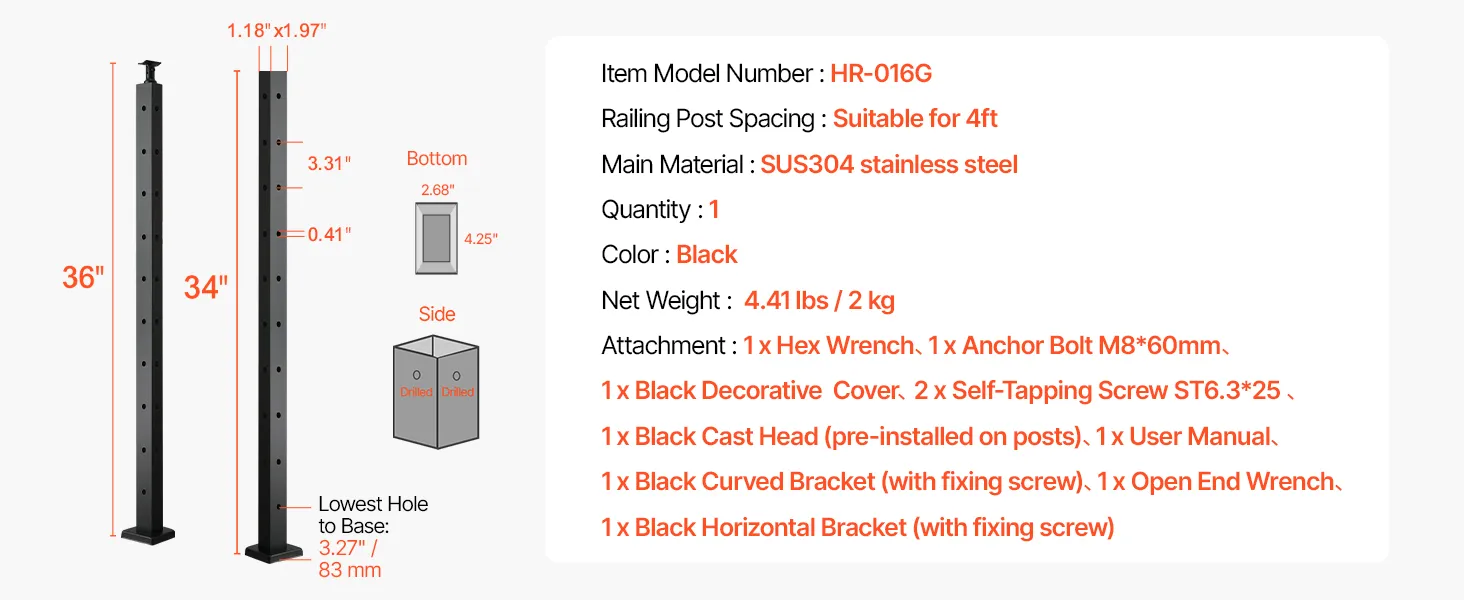Resistente y duradero: Nuestro poste de pasamanos con cable está fabricado con acero inoxidable SUS304 de alta calidad, que ofrece excelente resistencia a la oxidación y protección contra la corrosión para una larga duración. Sin embargo, no se recomienda su uso en zonas costeras