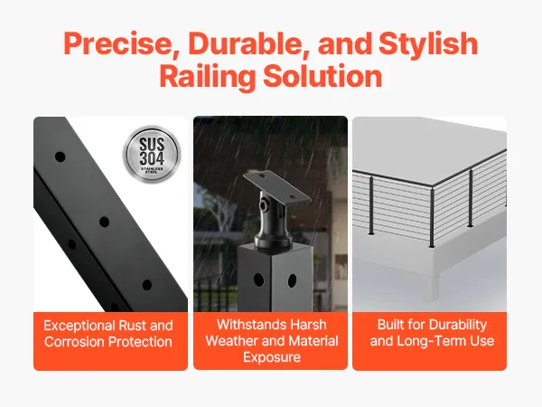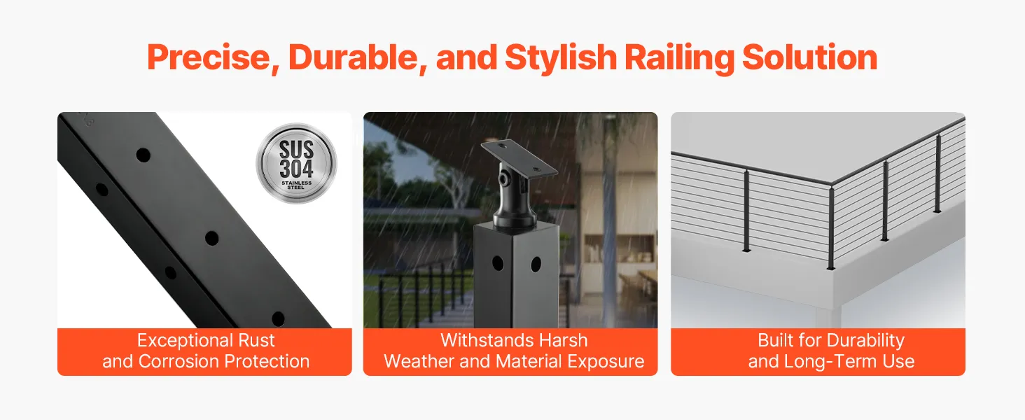 Fabricados en acero inoxidable SUS304 de alta resistencia, nuestros postes de barandilla de cable son duraderos y fáciles de instalar, con orificios y herrajes pretaladrados, son perfectos para asegurar cubiertas, barandillas, etc., cumpliendo con todos los requisitos de la normativa.
