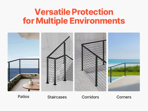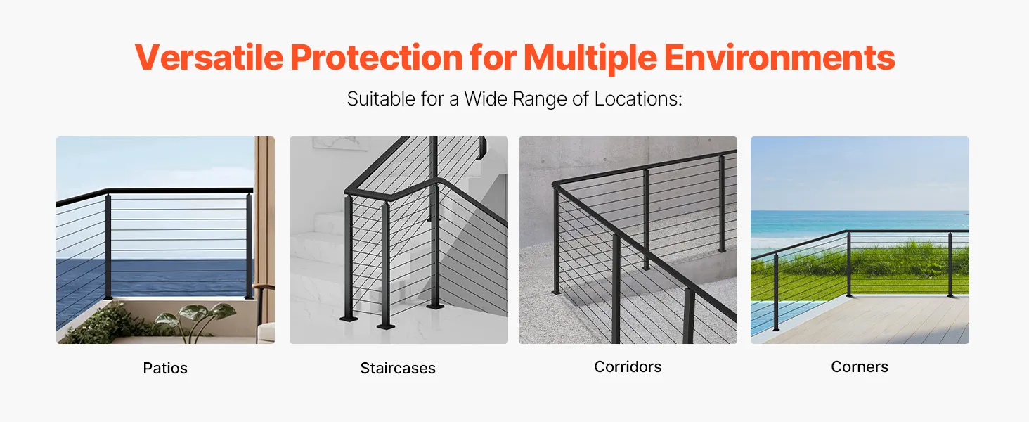 Protección para múltiples escenas: Nuestro poste de riel de cable es adecuado para protección tanto en interiores como en exteriores, incluidas terrazas, escaleras, porches, cercas, patios, balcones, jardines, edificios residenciales, oficinas comerciales, hoteles, garajes y más