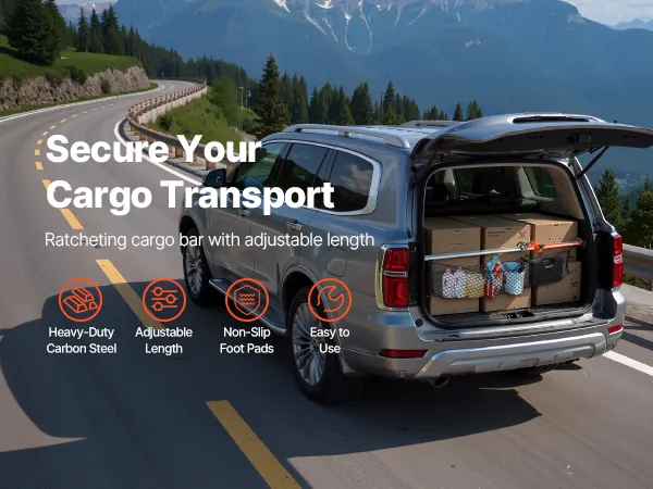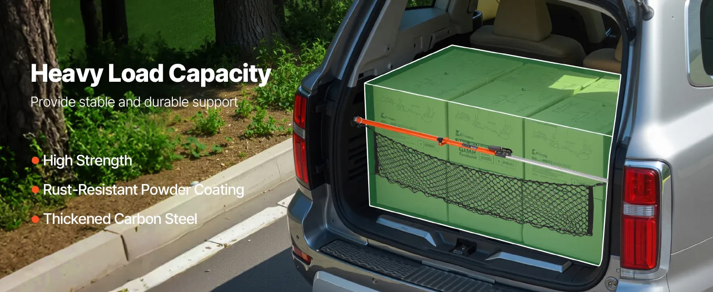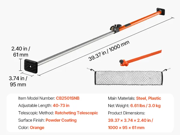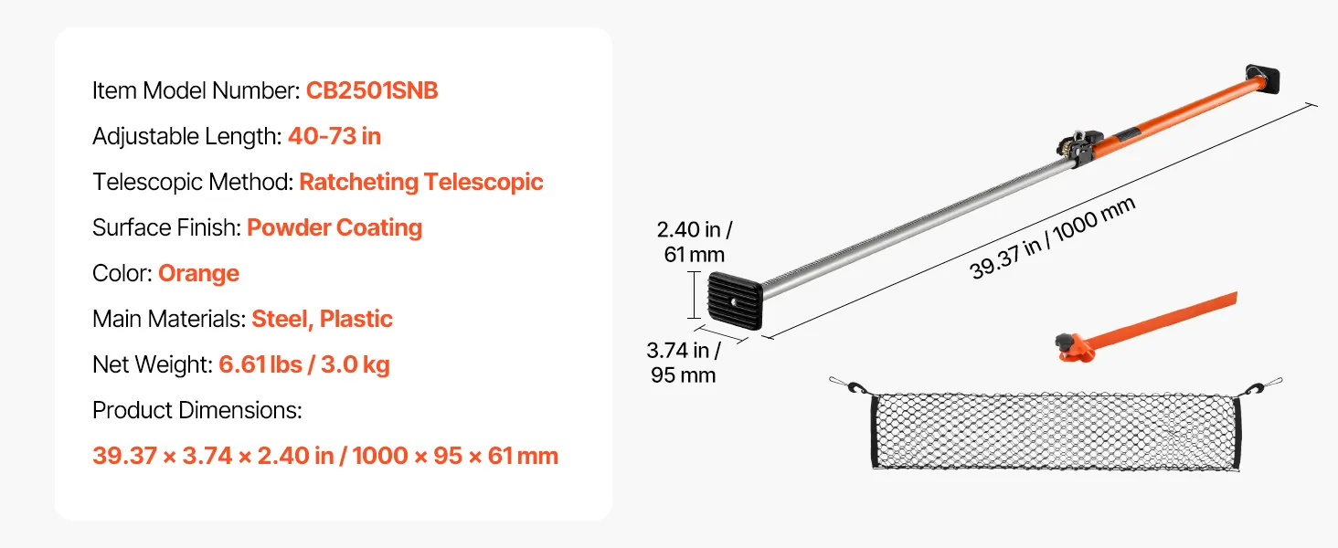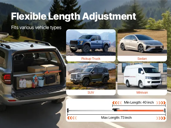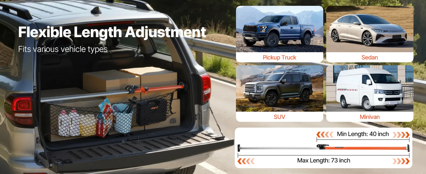 Ajuste flexible de longitud: Este estabilizador de carga con trinquete se puede ajustar con flexibilidad en longitud entre 1016-1854 mm. Ideal para sedanes y SUV, garantiza estabilidad y fiabilidad para cualquier carga
