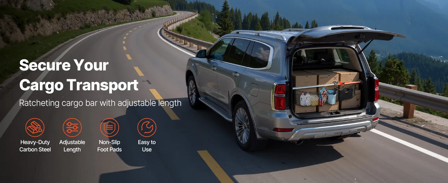 Esta barra de carga telescópica se ajusta de forma continua entre 1016 y 1854 mm y se adapta fácilmente a diversos tipos de vehículos. Ya sea un sedán o un SUV, mantiene la carga firmemente en su lugar.