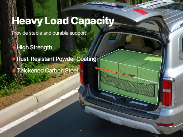 Fácil de usar: El mecanismo de trinquete permite un fácil ajuste telescópico y un bloqueo seguro de la longitud. También cuenta con una red de carga para organizar objetos pequeños y una barra divisoria que separa la carga para evitar deslizamientos o colisiones, lo que aumenta la seguridad del transporte