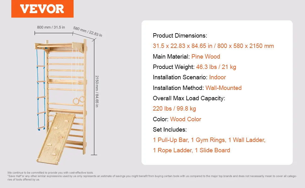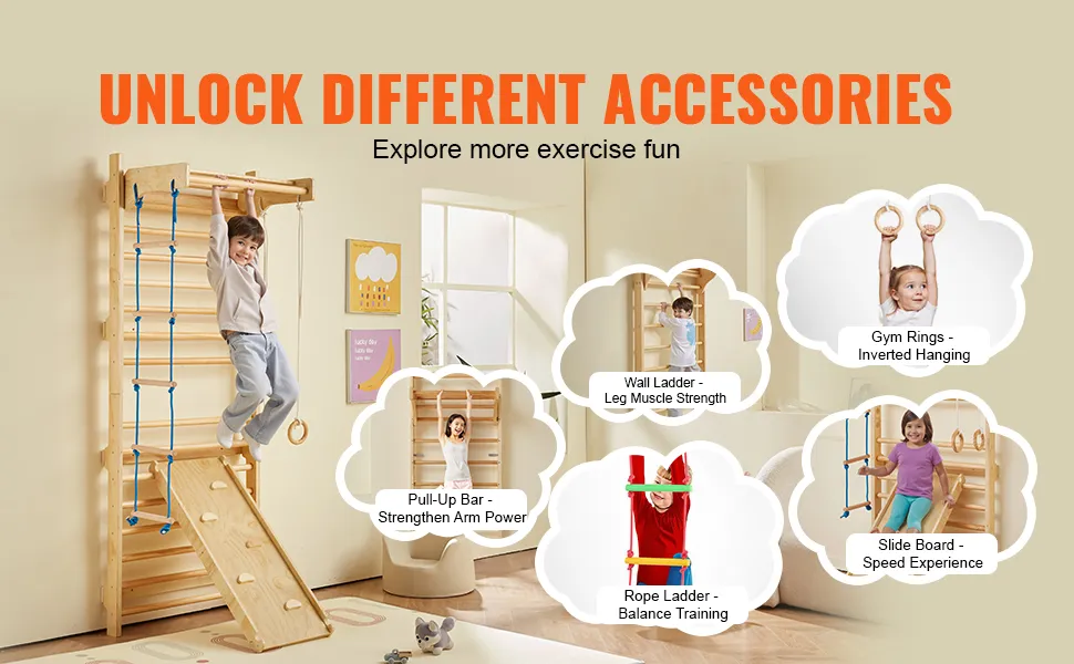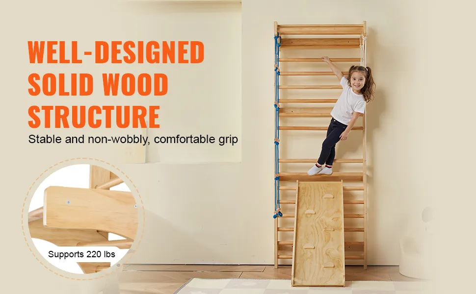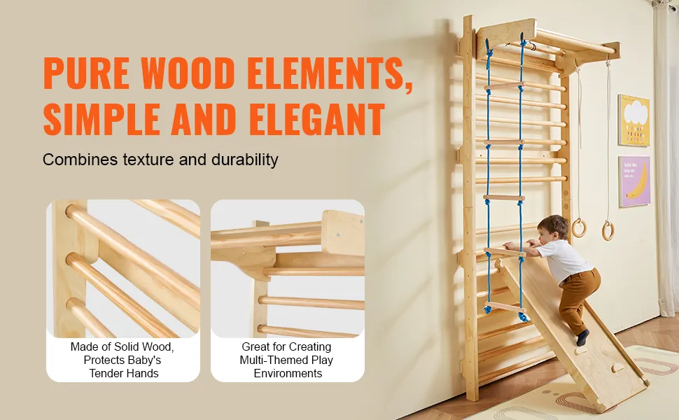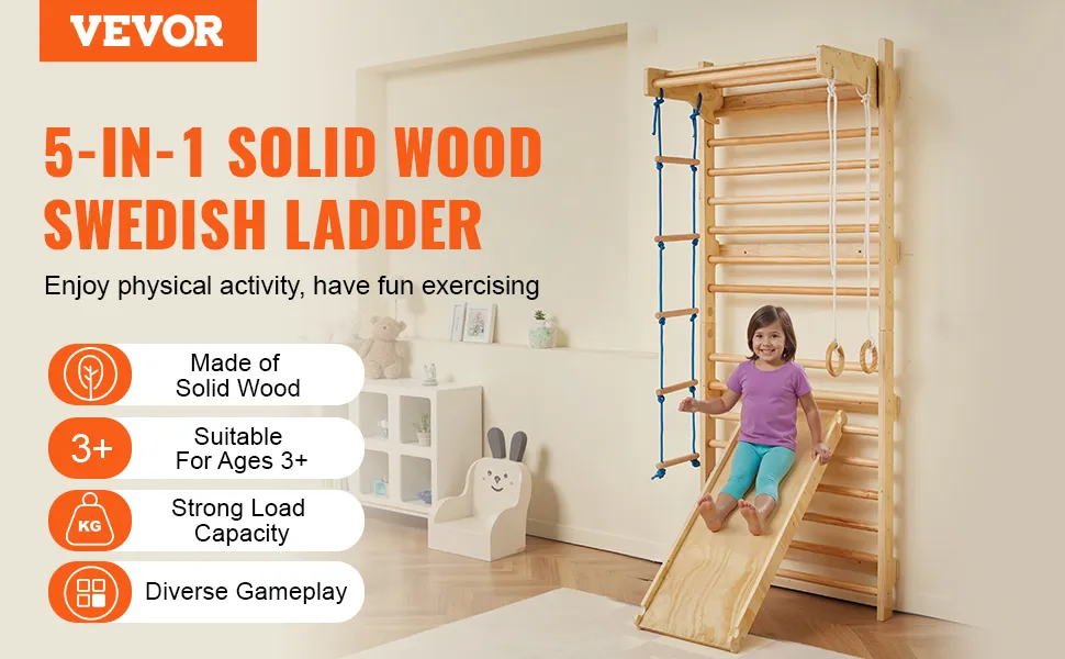 VEVOR 5 en 1 Juguetes de Escalada de Madera, Carga de 99,8 kg, Escalera Sueca de Pared con Barra de Dominadas, Anillos de Gimnasio, Escalera de Cuerda, Escalera de Pared, Tablero Deslizante