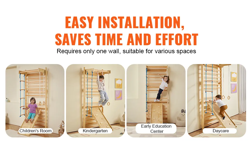 Fácil instalación: Nuestra pared sueca es fácil y rápida de instalar con una guía de instalación detallada. Se puede instalar en habitaciones de niños, centros de aprendizaje temprano o preescolares, lo que la hace versátil para una variedad de espacios.