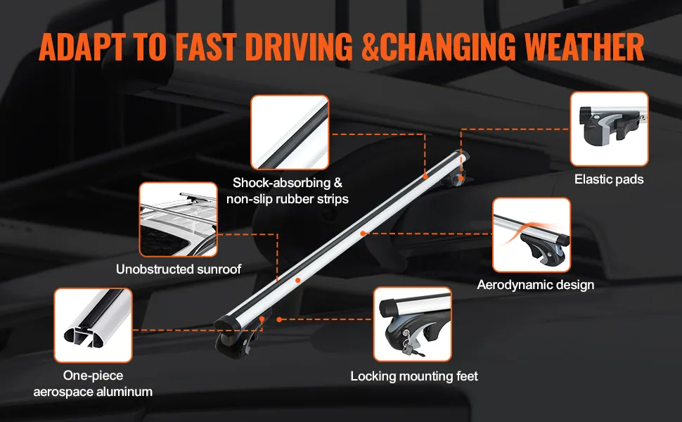 Sin ruidos ni vibraciones: El diseño aerodinámico del tubo de aluminio minimiza la resistencia al viento y el ruido, mientras que las almohadillas de goma en los pies de montaje protegen su vehículo contra rasguños y garantizan un viaje tranquilo sin interrupciones para usted o sus hijos