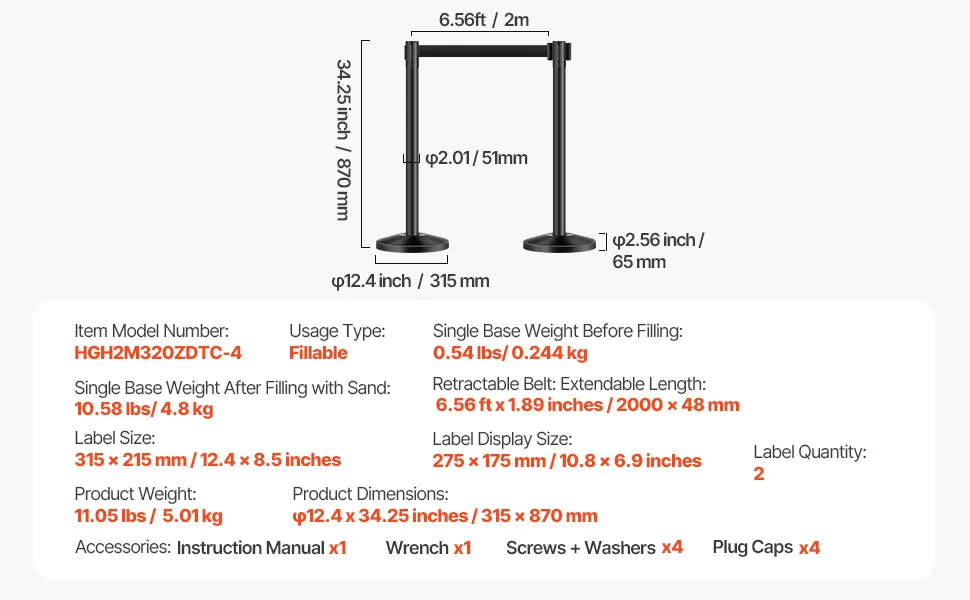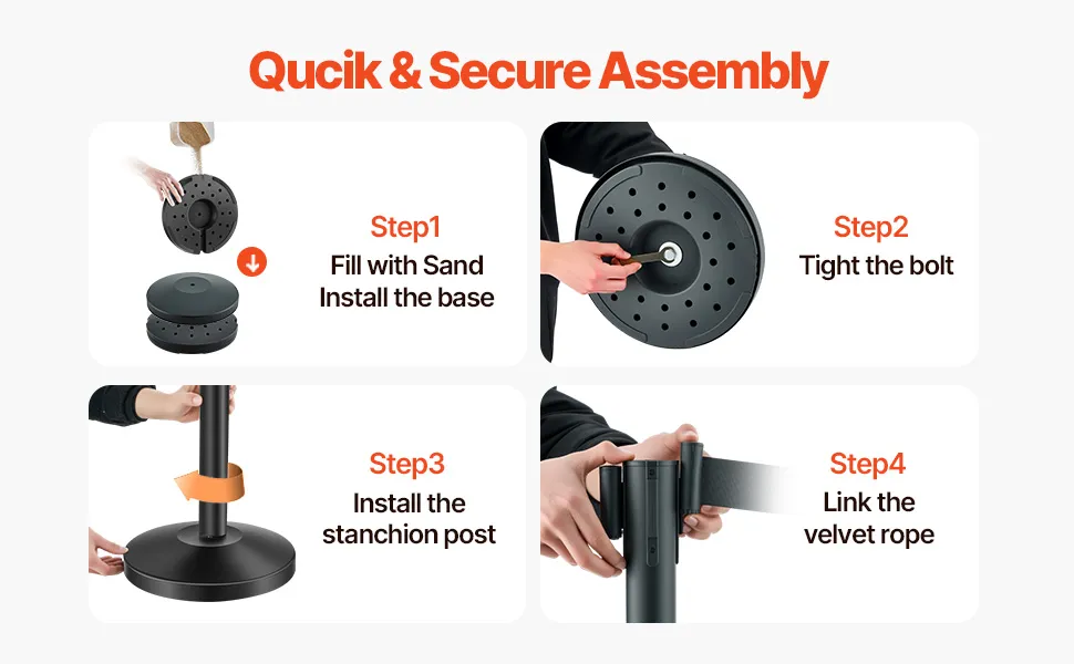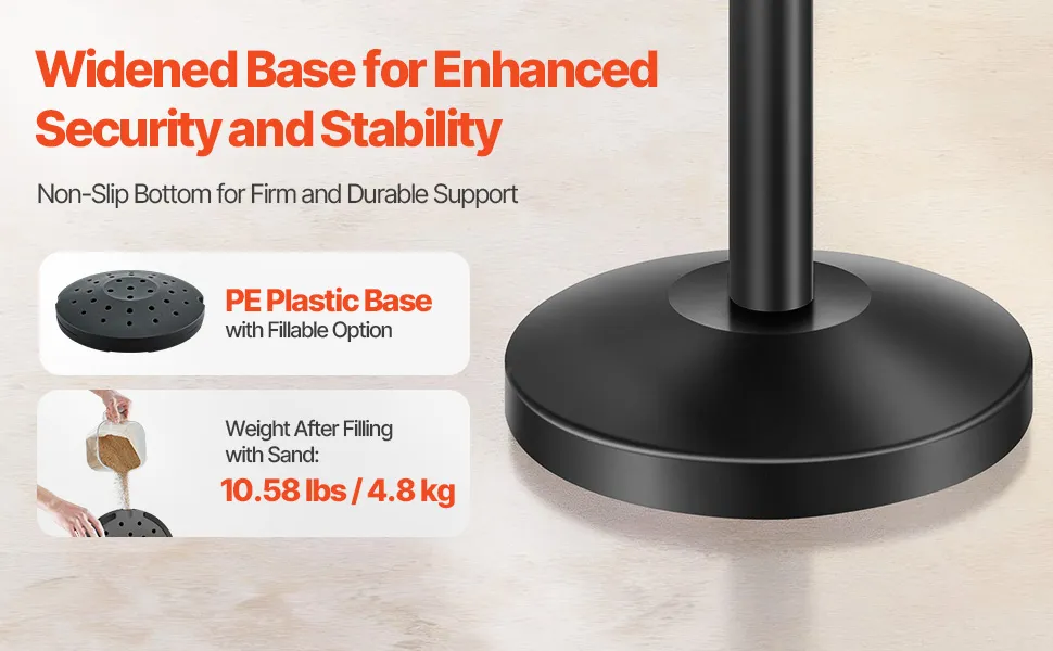 Base estable: Con un diseño de base expandida con un fondo antideslizante y rellenable, nuestro sistema de control de multitudes es fácil de estabilizar; solo llénelo con arena para mejorar su estabilidad. Con un peso de 4,8 kg cuando está lleno, proporciona un soporte fuerte, capaz de soportar la luz solar directa o impactos inesperados
