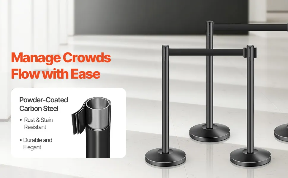 Elegante y duradero: El poste de seguridad está fabricado con un marco de acero al carbono resistente y recubierto con un acabado duradero, lo que garantiza un control y una separación de multitudes confiables. Ya sea en pasillos de compras, lugares deportivos o reuniones en restaurantes, nuestro producto administra el espacio de manera eficaz y mantiene las cosas organizadas