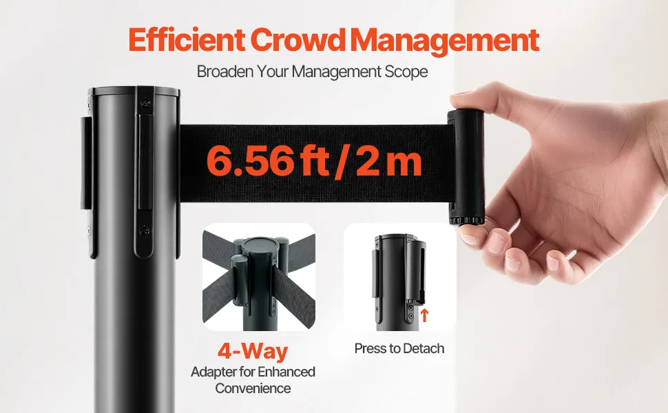 Amplia cobertura: Las barreras de control de multitudes están diseñadas con una correa retráctil, equipada con una correa de 2 m y un adaptador de cuatro vías. Ofrece una solución flexible y conveniente para la gestión del espacio, que se ajusta fácilmente para satisfacer las necesidades de varios entornos y eventos
