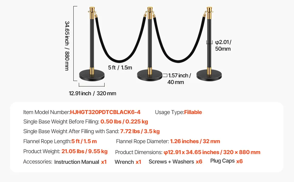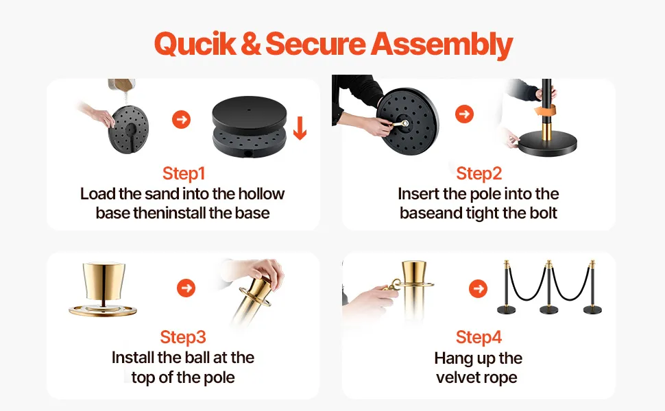 Montaje rápido: Simplemente atornille la base en su lugar, llénela con arena y su cuerda de terciopelo para control de multitudes estará lista para usar. Fácil de instalar y aún más fácil de usar cuando lo necesite