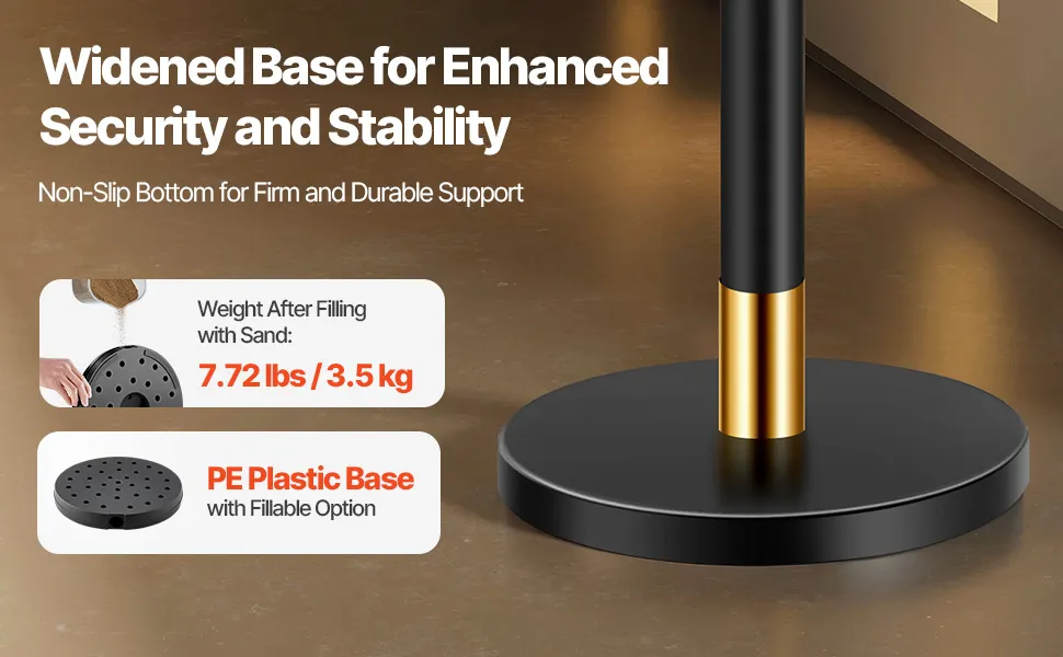 Resistente y segura: Con una base ancha y antideslizante y un diseño rellenable, nuestra barrera de control de multitudes está diseñada para durar. La base rellenable puede soportar hasta 3,5 kg cuando se llena con arena, y resiste la luz solar directa y los impactos repentinos sin fallar