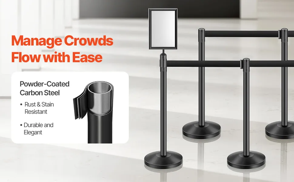 Elegante y duradero: El poste de seguridad está fabricado con un marco de acero al carbono resistente y recubierto con un acabado duradero, lo que garantiza un control y una separación de multitudes confiables. Ya sea en pasillos de compras, lugares deportivos o reuniones en restaurantes, nuestro producto administra el espacio de manera eficaz y mantiene las cosas organizadas
