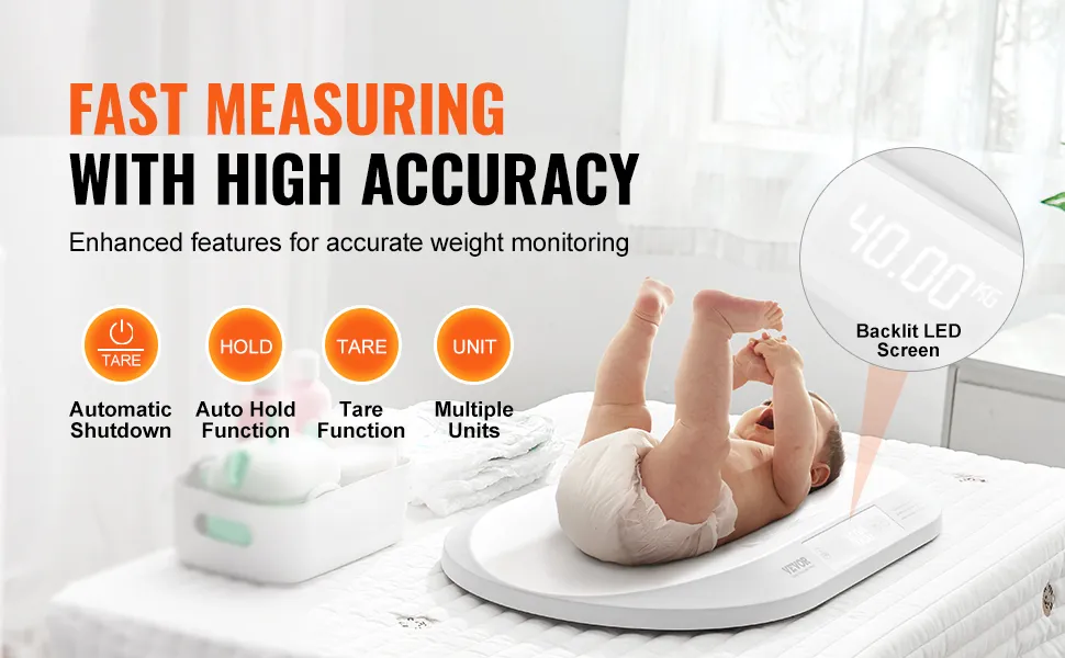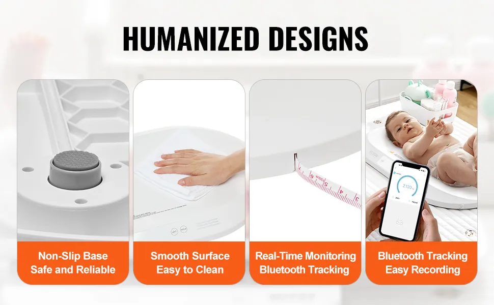 Seguimiento por Bluetooth del crecimiento del bebé: la báscula inteligente para bebés VEVOR, actualizada con Bluetooth 4.0, permite registrar y analizar fácilmente el peso y los datos de crecimiento de su bebé. El seguimiento en tiempo real lo mantiene informado sobre cada etapa del desarrollo del bebé.