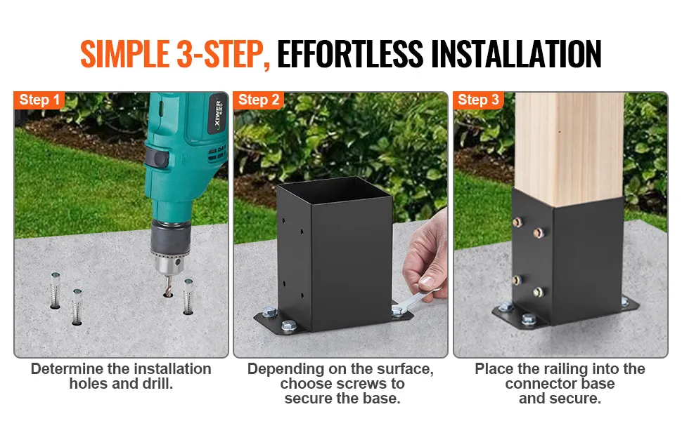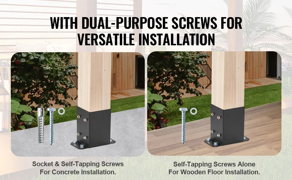 Estas bases para postes tienen orificios para tornillos pretaladrados. Esta característica hace que el proceso de instalación sea rápido y eficiente. Puede alinear y asegurar fácilmente las bases utilizando los accesorios incluidos. Ahorra tiempo al proporcionar un diseño conveniente que garantiza que pueda completar su proyecto más rápido sin necesidad de perforaciones o ajustes adicionales. La facilidad del proceso de instalación hace que estas bases para postes sean ideales tanto para aficionados al bricolaje como para profesionales.