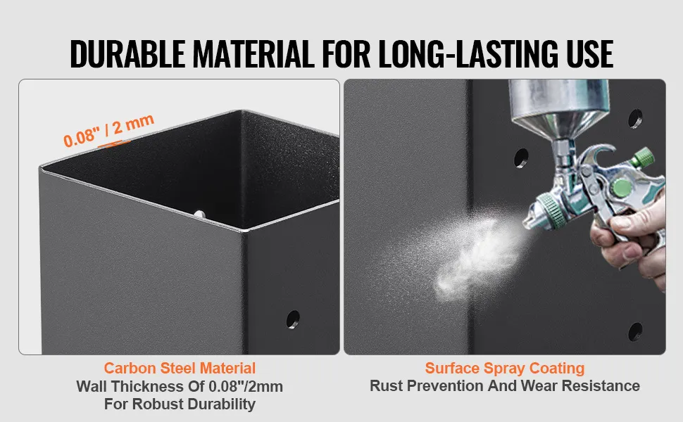 El material tiene un espesor de pared de 0,08 pulgadas, lo que lo hace fuerte y resistente a la deformación. Estas bases están recubiertas con un revestimiento en aerosol con protección contra el óxido y la corrosión que garantiza la longevidad, incluso en condiciones climáticas adversas. Su construcción robusta las hace adecuadas tanto para proyectos interiores como exteriores, proporcionando un soporte duradero sin necesidad de reemplazos frecuentes. El anclaje para postes de madera de alta resistencia garantiza una durabilidad a largo plazo en todos los entornos.