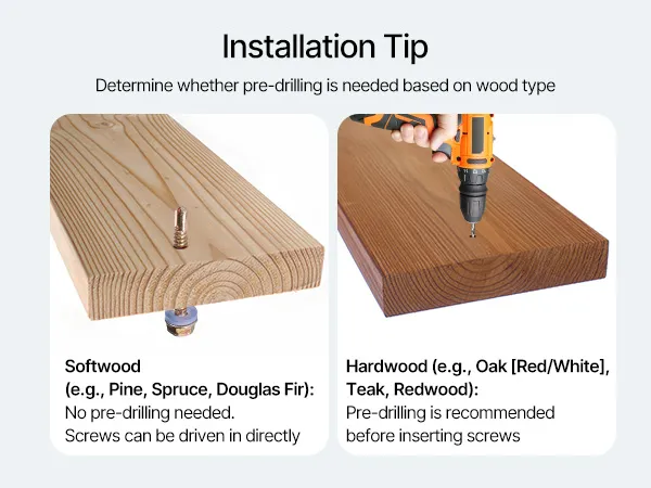 A2: Para maderas blandas (p. ej., pino, abeto rojo o abeto Douglas), los tornillos se pueden atornillar directamente. Para maderas duras (p. ej., roble rojo/blanco, teca o secuoya roja), se requiere una perforación previa antes de la instalación.