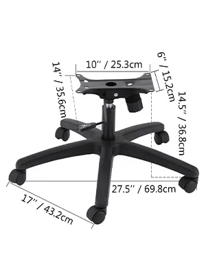 La parte inferior de la silla de oficina cuenta con un cilindro de alta resistencia y 5 ruedas. Este kit de piezas de silla de oficina incluye todas las piezas que necesita debajo del asiento. La placa del asiento presenta un patrón de orificio de montaje de 15,2 x 25,8 cm y tiene una capacidad de hasta 145 kg. El cilindro de gas neumático de servicio pesado tiene un recorrido de 12,7 cm desde la configuración más baja a la más alta y tiene una capacidad de hasta 159 kg. La base tiene un diámetro de 71,1 cm que es ideal para las sillas ejecutivas de estilo inclinable / giratorio. Las ruedas tienen una rueda de 60 mm de diámetro y son ideales para áreas alfombradas.
