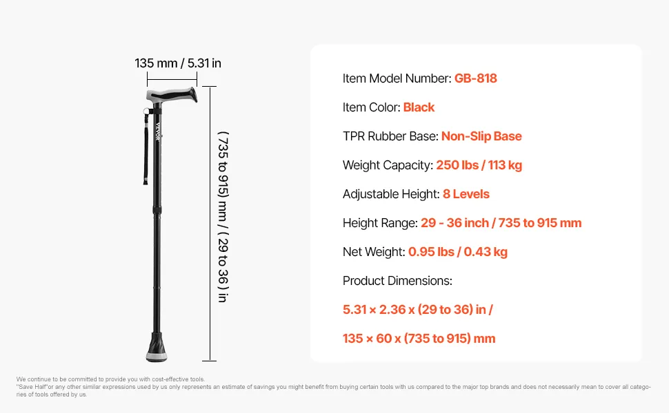 VEVOR Bastón Plegable para Caminar, Altura de 8 Niveles y Punta Antideslizante, Ayuda para Caminar de Aluminio Ligera y Portátil para Adultos Mayores, Carga 113 kg, 135 x 60 x (735 a 915) mm