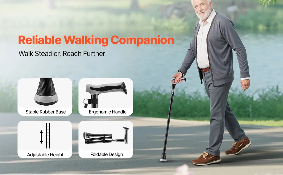 Portátil y fácil de guardar: Nuestro bastón para caminar para adultos mayores es liviano y portátil, y cuenta con un diseño plegable que permite plegarlo rápidamente hasta alcanzar un tamaño compacto. Cabe fácilmente en una mochila o bolso de viaje, lo que lo convierte en un compañero confiable para las salidas diarias o las aventuras de viaje.