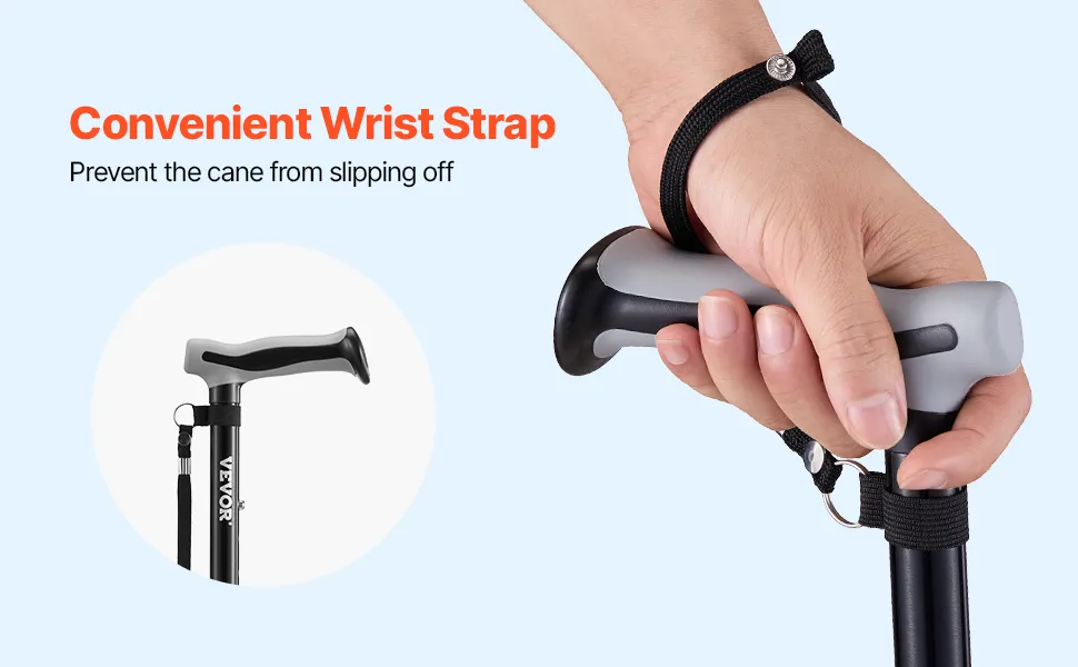 La correa de muñeca bien pensada evita que el bastón plegable se caiga accidentalmente, lo que mejora la seguridad durante su uso.