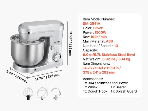 VEVOR Batidora Ajustable de Pie, Procesador de Alimentos de 1500 W para Repostería, con Bol de Acero Inoxidable, 5,7 L, Gancho para Amasar, Batidor y Varillas, 10 Velocidades, 375 x 241 x 292 mm