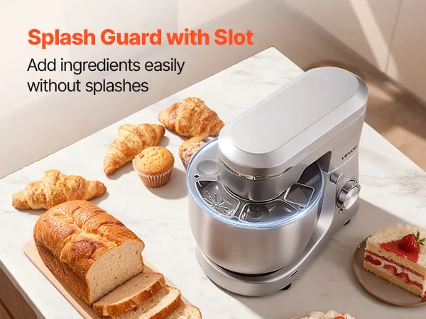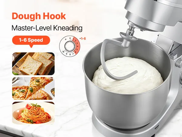 Tazón de gran capacidad: Nuestra batidora de pie cuenta con un espacioso tazón de acero inoxidable de 5,7 L, que le permite mezclar grandes cantidades de masa, hornear galletas con chispas de chocolate, hacer pan fresco o incluso preparar puré de papas para su próxima gran comida