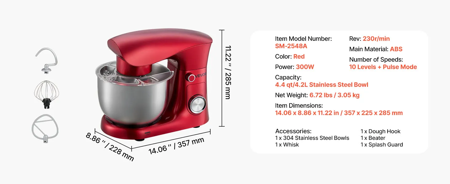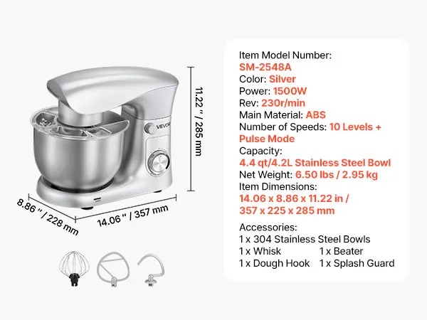 VEVOR Batidora de Pie/Máquina de Cocina para Hornear, 1500 W, con Bol de Acero Inoxidable, 4,2 L, Gancho para Masa, Batidor y Varillas, Basculante Ajustable de 10 Velocidades, 357 x 225 x 285 mm