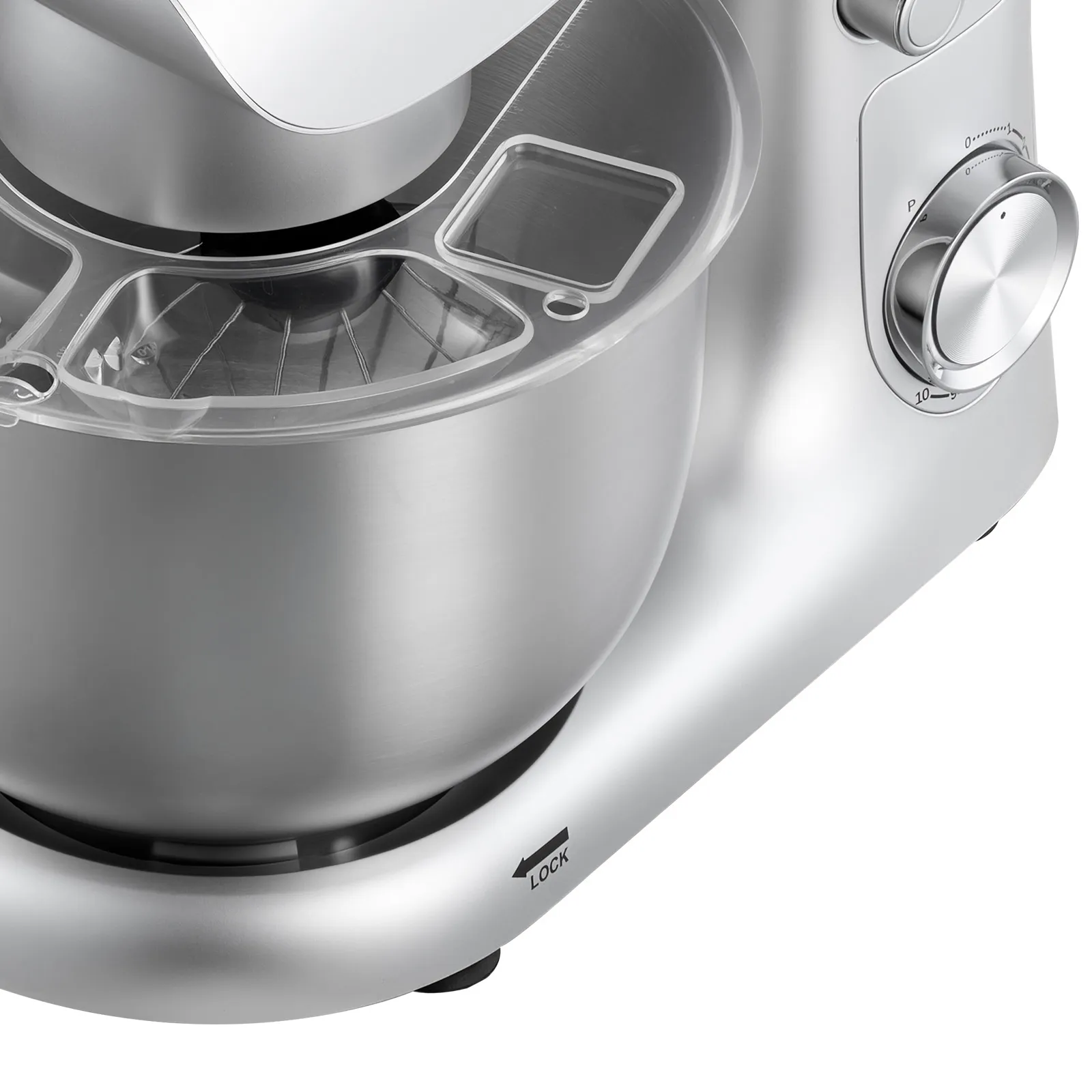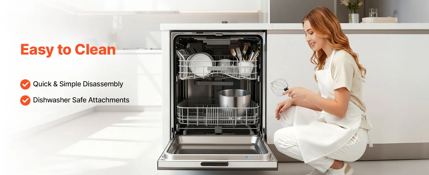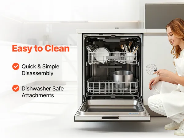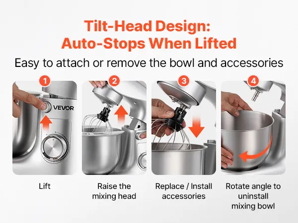 Fácil de desmontar y limpiar: El cabezal se detiene automáticamente al levantarlo, lo que facilita la colocación y extracción de los accesorios de mezcla. Para desmontarlo, basta con girar y levantar el bol. Los accesorios, que incluyen el bol, el gancho y la varilla, están fabricados en acero inoxidable apto para uso alimentario y son aptos para lavavajillas